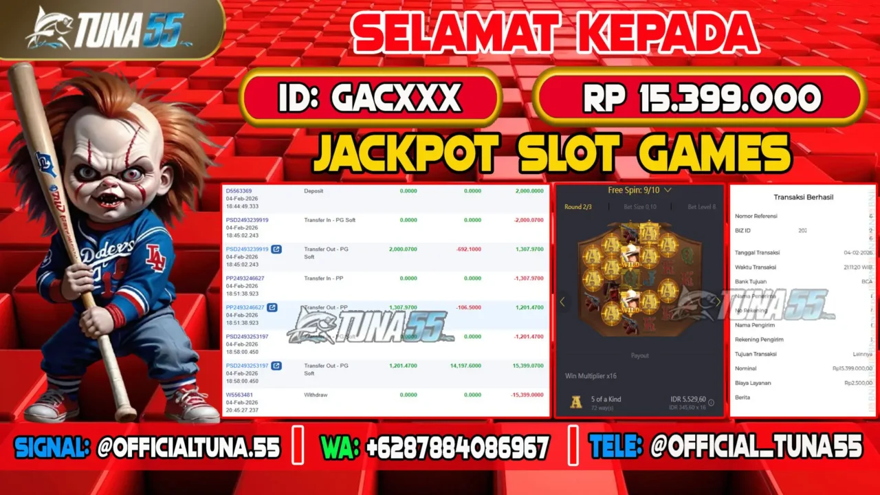 Bukti jackpot slot games Tuna55 dengan kemenangan Rp 5.000.000, menampilkan permainan Mahjong Ways, ID pengguna JIMXXX
